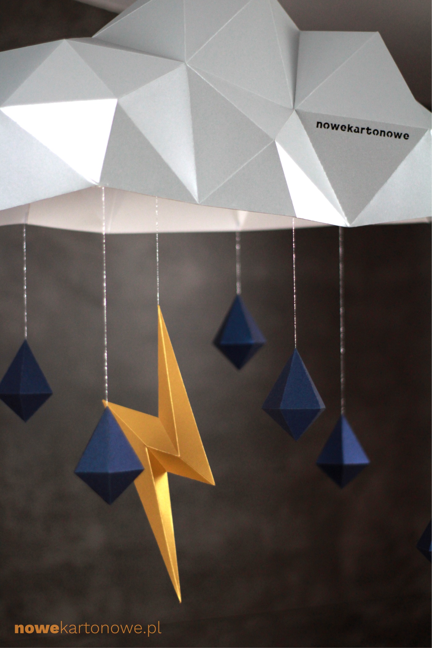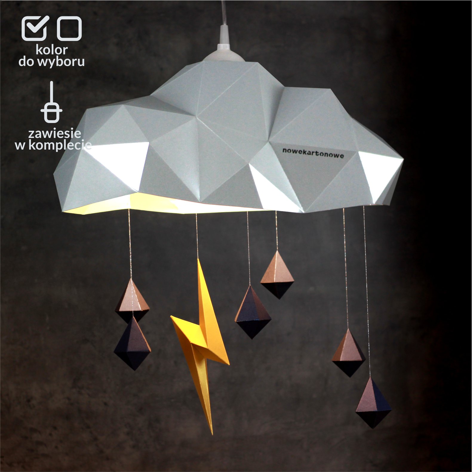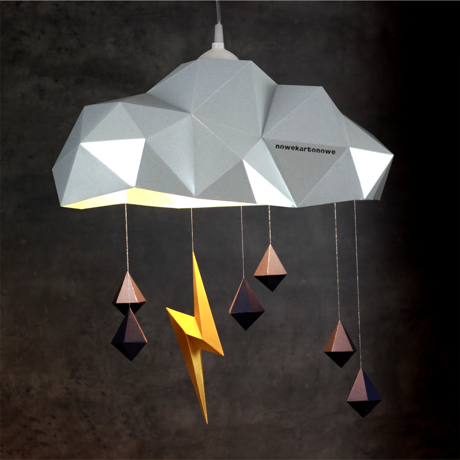 Model lampy „Chmurka Burzowa” to najbardziej elegancki z  naszych modeli. Do tego, wyjątkowo praktyczny bo tak naprawdę jest kompletną lampą – łącznie z kablem i oprawką. Świetnie nadaje się do pokoju dziecięcego. Po złożeniu ma wymiary ok. 60cm x 46cm x 55cm. Model wykonany jest z kartonu o dwustronnie metalizowanej powierzchni, z certyfikatem FSC, wykonany z celulozy ECF, barwiony w masie. Z uwagi na materia, z którego zrobiony jest abażur należy używać wyłącznie żarówek typu LED.