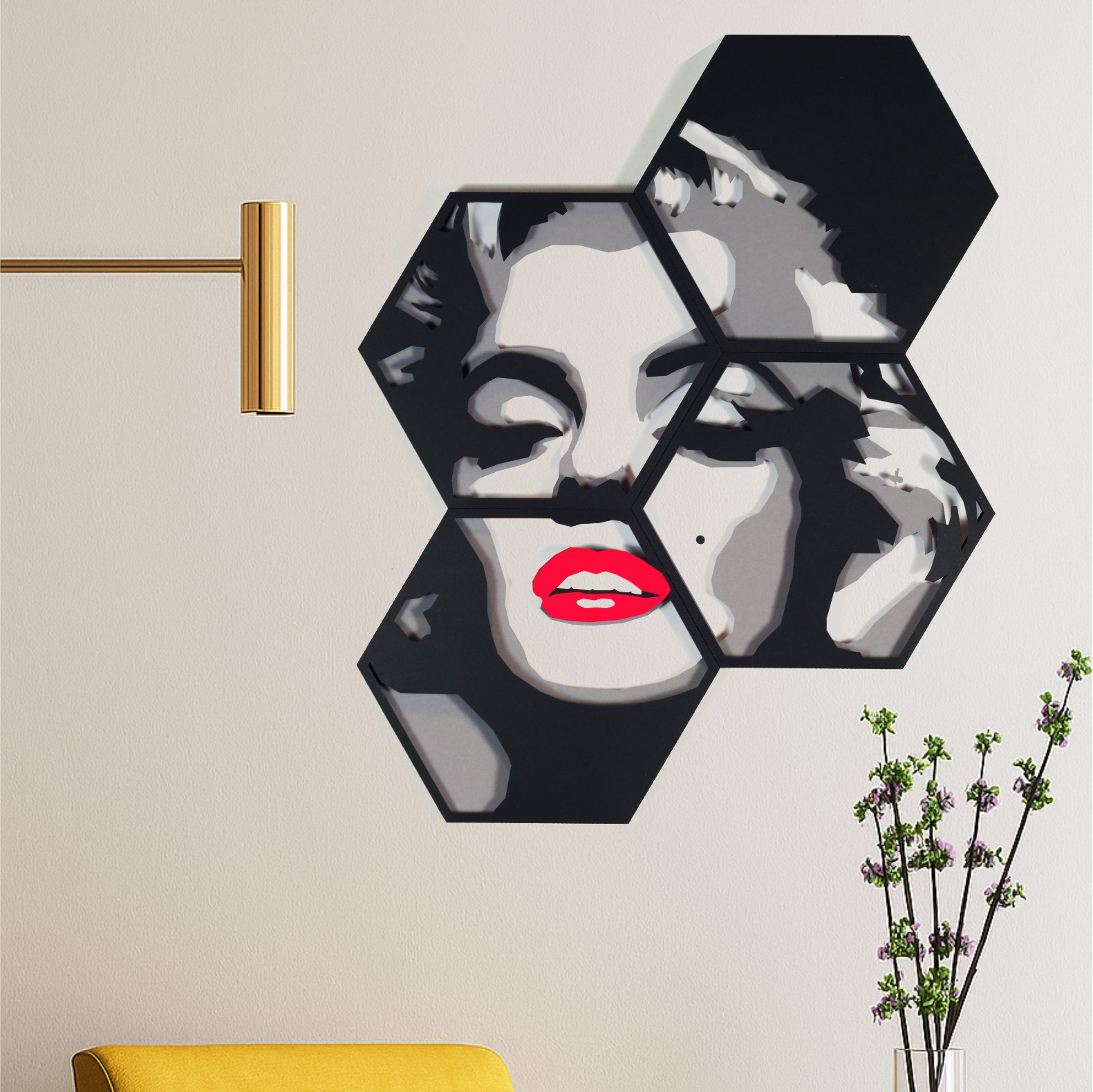 Dekoracja składa się z czterech sześciokątnych paneli, tworzących razem unikalną kompozycję, jakiej nie znajdziesz nigdzie indziej.