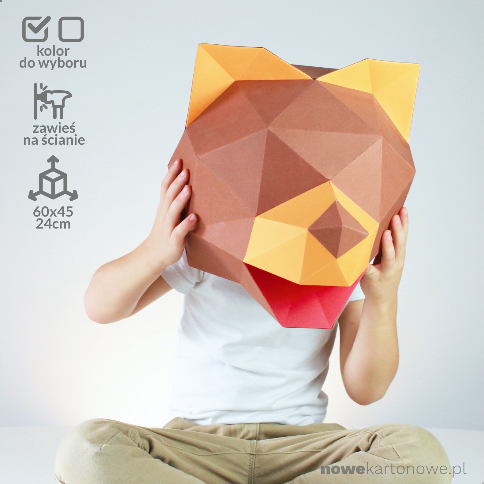 Miś jest naszym pierwszym modelem i mamy do Niego ogromny sentyment. Stał się także naszym logo, i choć nie sprzedaje się specjalnie dobrze, bo nie jest różowy, ani nie jest bohaterem żadnej „modnej” bajki to i tak zawsze będziemy go kochać. Może pokochacie go i Wy;). Po złożeniu ma wymiary ok. 31cm x 28cm x 25cm. i wykonany jest z kartonu o gramaturze 270g/m2. Model posiada specjalne nacięcie , dzięki któremu można zawiesić go na ścianie.
