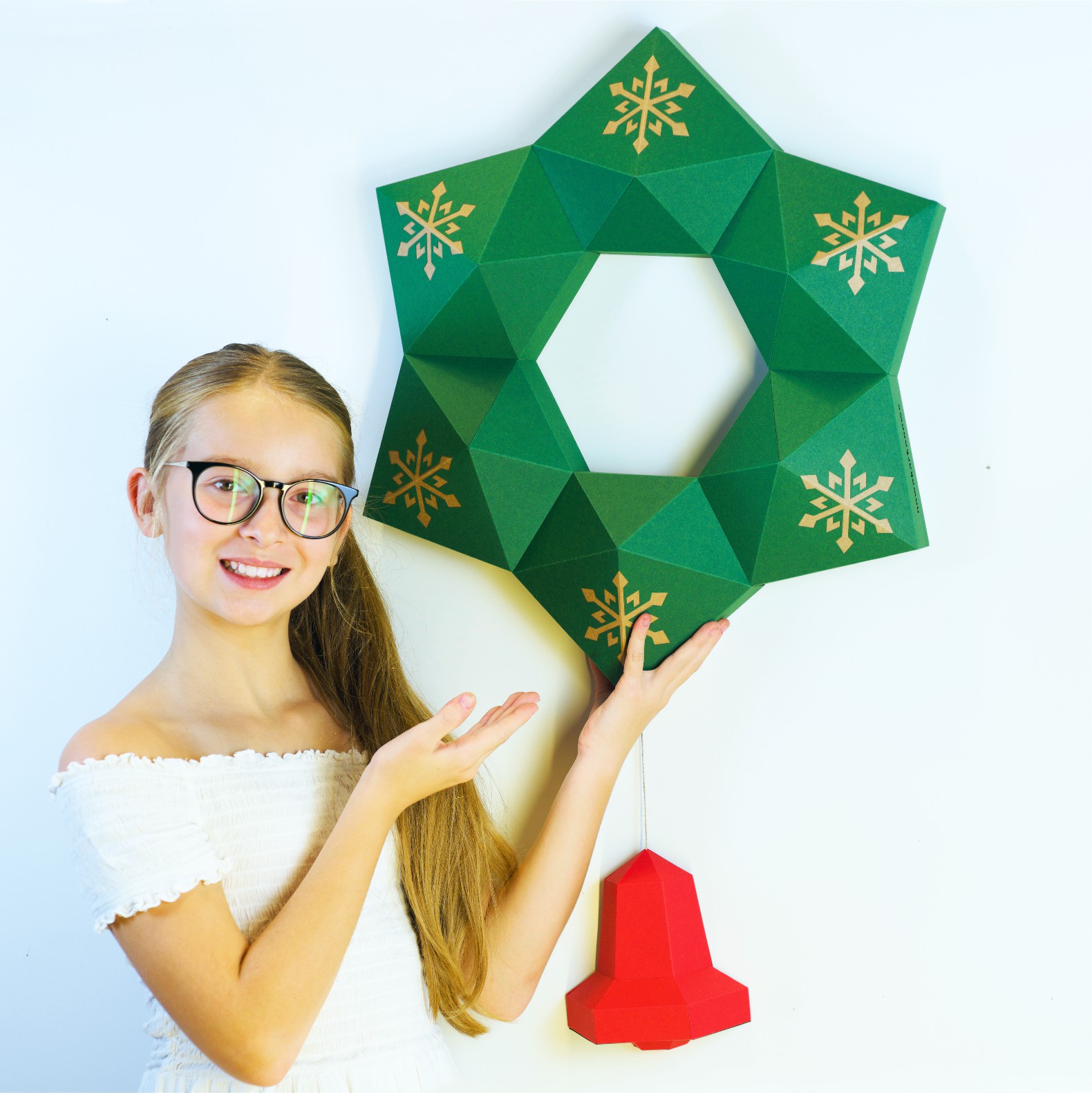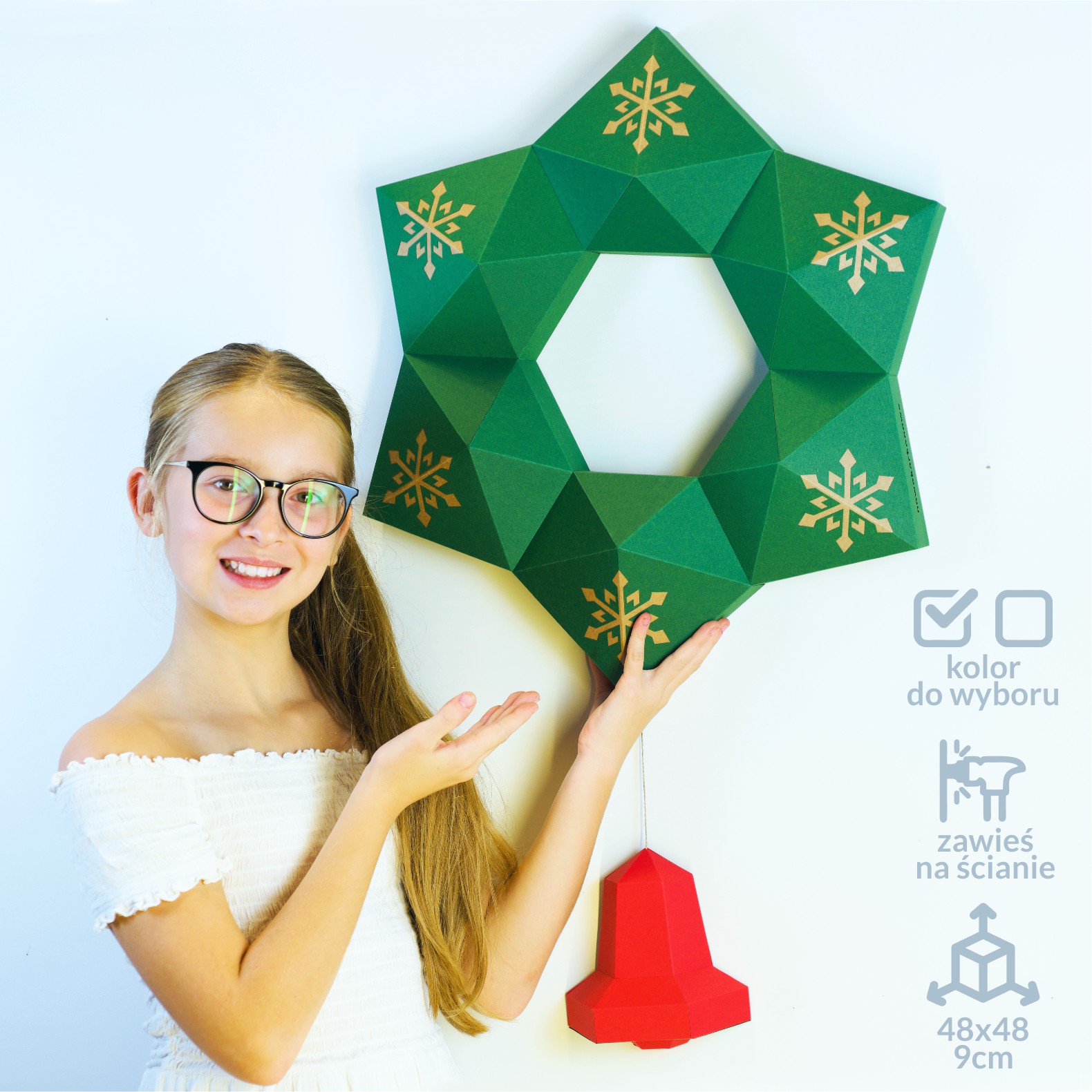 Święta! Święta! A gdyby tak ustroić dom czymś kreatywnym i zrobionym własnoręcznie?  Nasz świąteczny stroik można powiesić na kominku (jeżeli macie, my niestety nie), na ścianie, albo na drzwiach. Ale przede wszystkim, można go rodzinnie poskładać. Po złożeniu stroik ma wymiary ok. 48cm x 48cm x 10cm + zwisający z niego bombko-dzwoneczek.