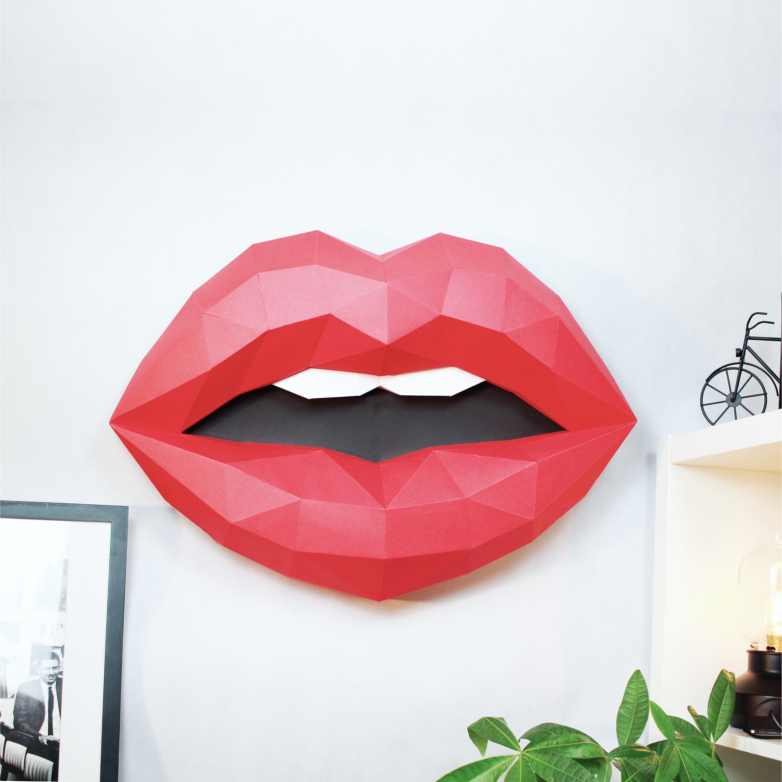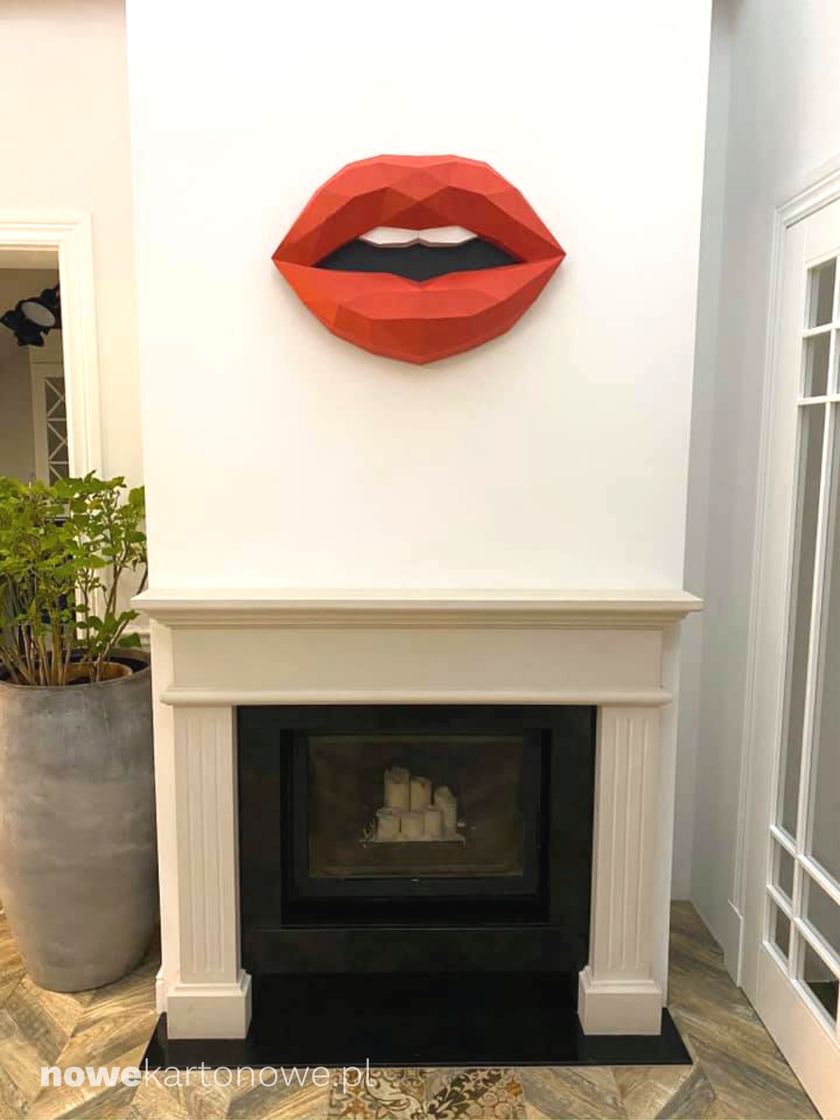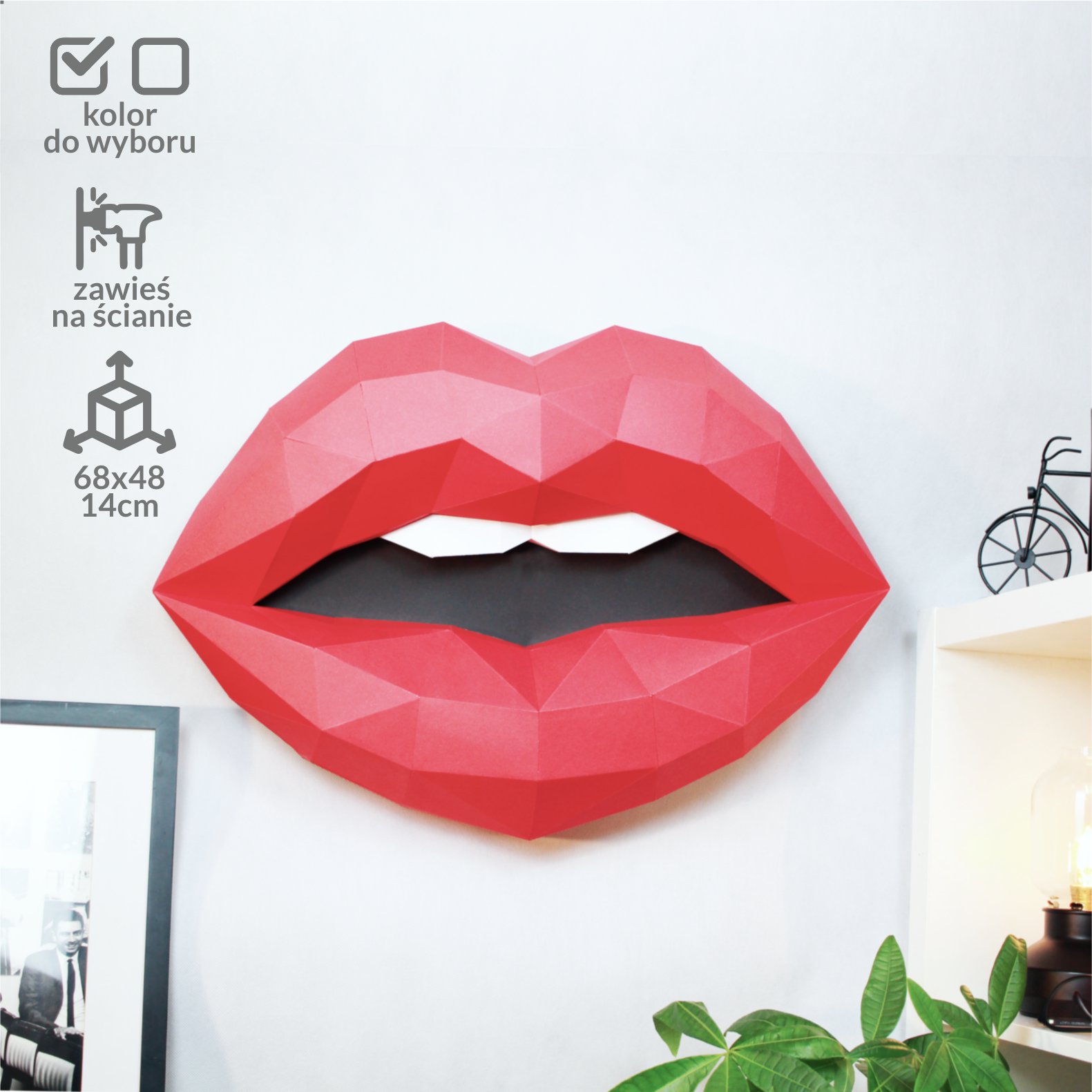 Oczywiście, że można nad kominkiem zawiesić sobie wypchanego jelenia. Tylko po co, skoro mogą znaleźć się tam nasze  kartonowe Usta. Są one łatwe do złożenia a do tego bardzo efektowne! Zestaw posiada specjalne nacięcie , dzięki któremu można zawiesić go na ścianie. A gdzie? … tę decyzję pozostawiamy już Wam;) . Po złożeniu model ma wymiary ok. 68cm x 48cm x 14cm. i wykonany jest z kartonu o gramaturze 270g/m2.