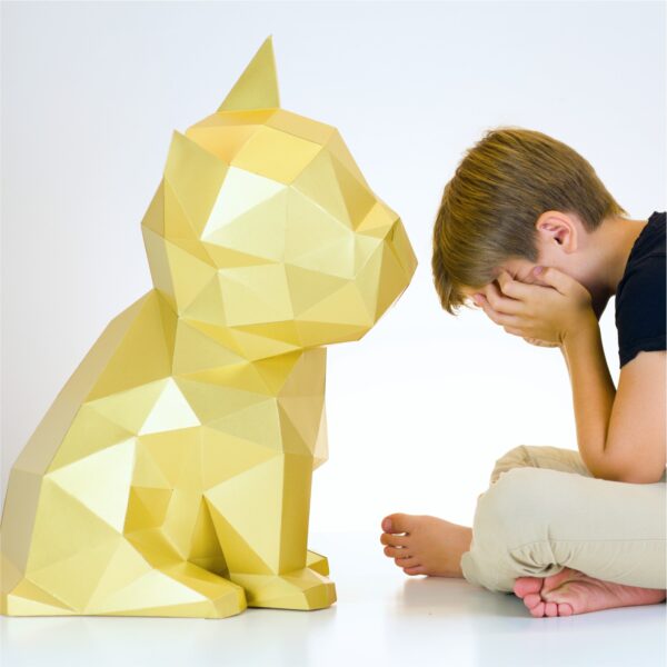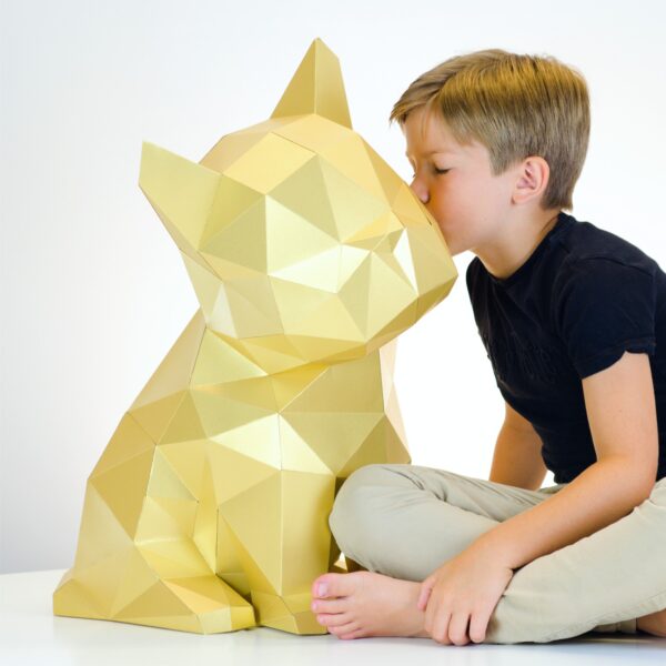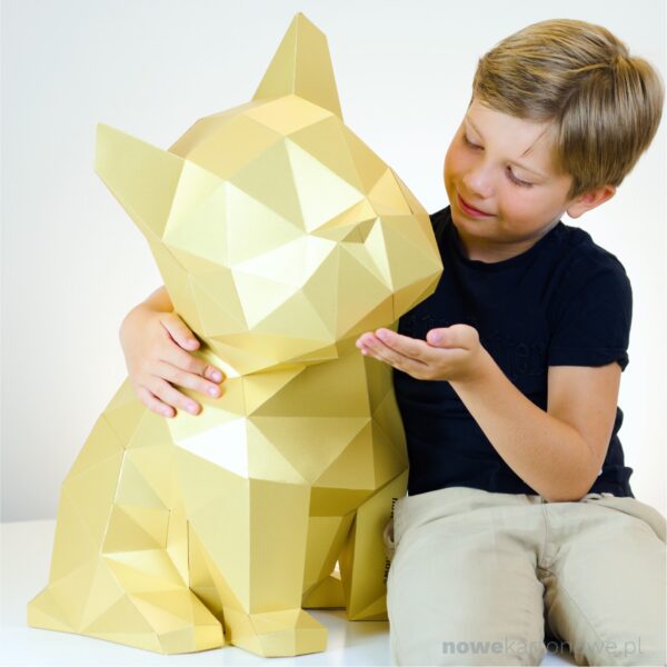 Tadam !!! Tak, dobrze widzisz. To jest złoty bulldog francuski. Lepiej już nie będzie. To jeden z niewielu naszych projektów, który można postawić na stole czy komodzie. Ma wymiary ok. 62cm x 49cm x 40cm i może przybrać dowolny kolor. Sam wybierz. Model wykonany jest z wyjątkowego kartonu o dwustronnie metalizowanej powierzchni. Posiada certyfikat FSC, wykonany jest z celulozy ECF i barwiony jest w masie.